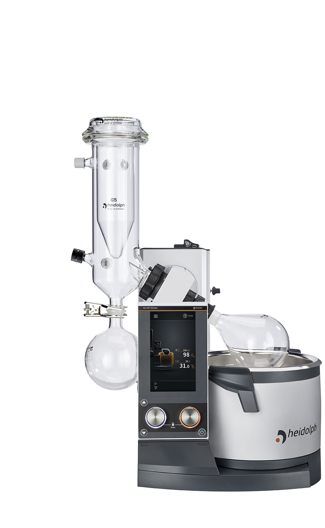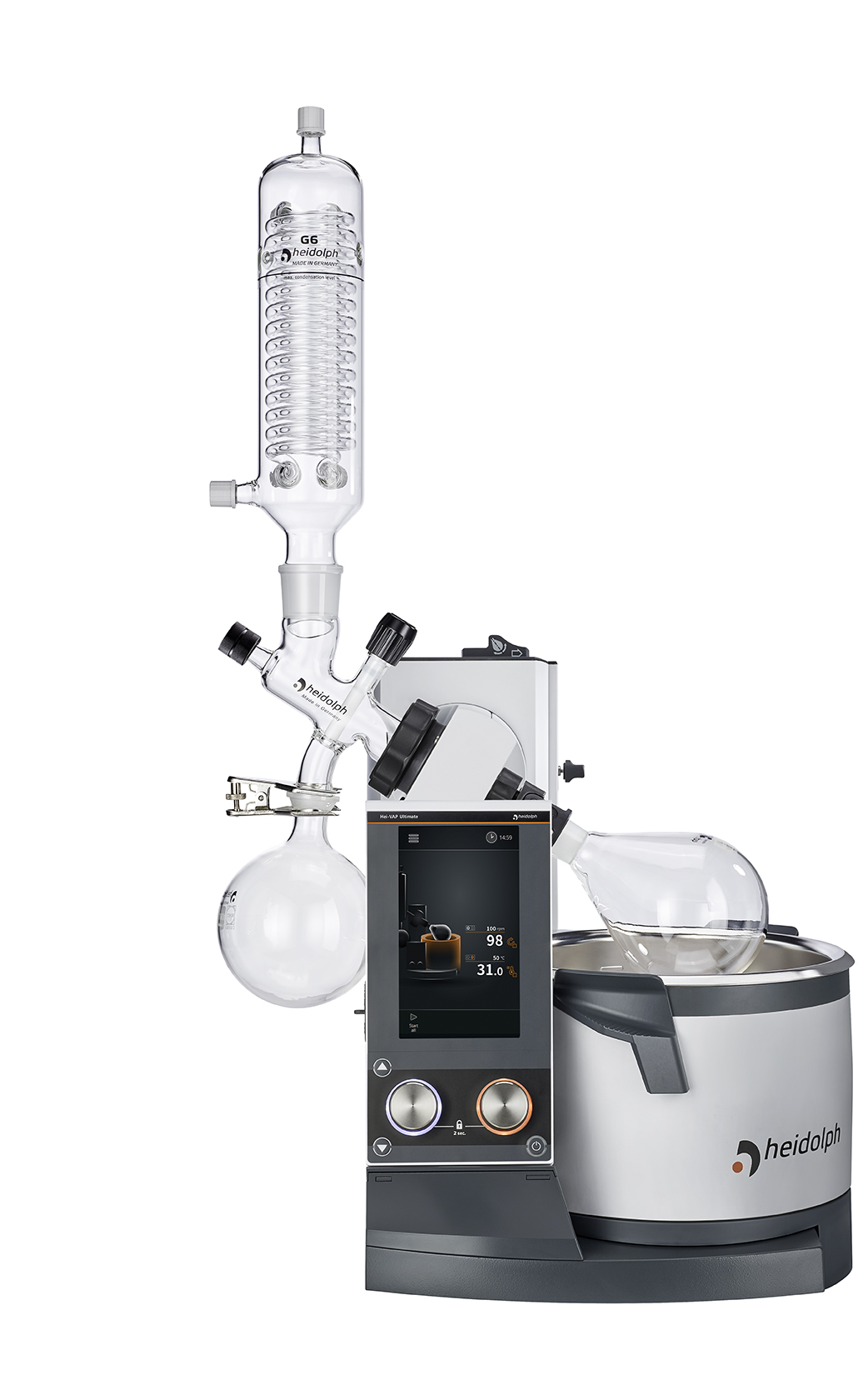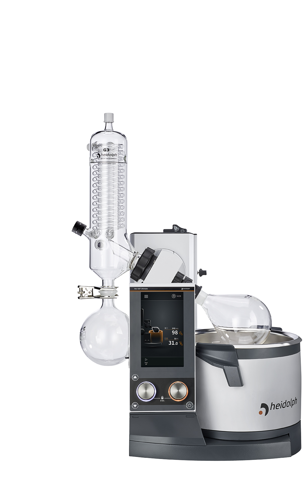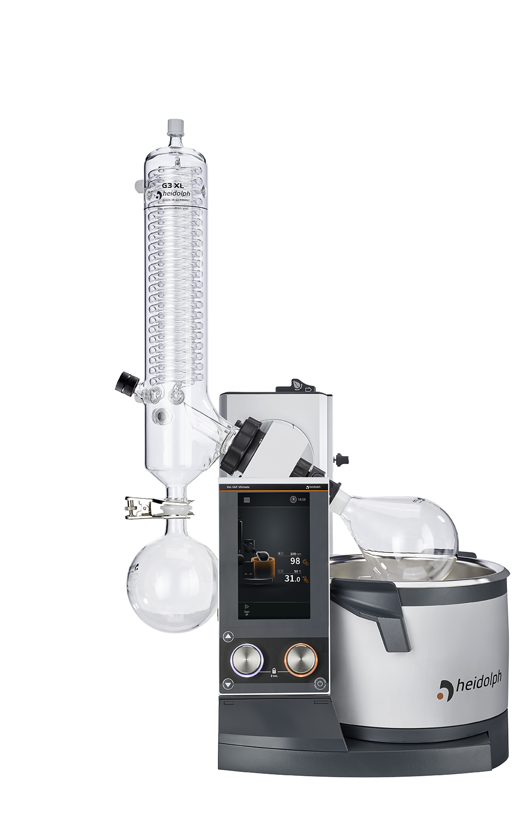 Rotatieverdampers Heidolph Hei-VAP Ultimate met motorlift, met een goed overzicht van de verschillende instellingen.